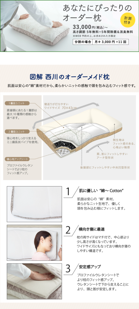 西川のオーダー枕が細かい調整もやってもらえてすごく良かったです(^ν^)