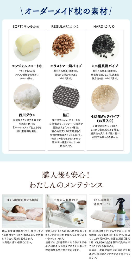 「お店ではちょうど良い高さだと思ったが、家のマットレスで寝てみたら高さが合わなかった」「使っているうちの中身がヘタって沈んできた」「臭いや汚れがきになる」など、枕は毎日使い続けるものなので、様々なお悩みが出てきます。そんな時にはぜひわたしんにお越しください。長い間、ベストな状態で使えるよう、サポートとメンテナンスをいたします!