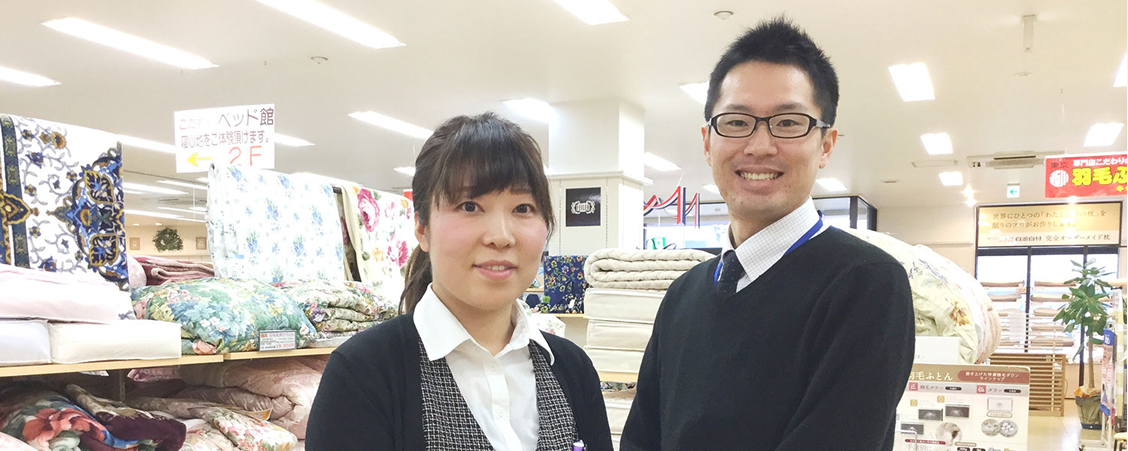 接客の仕事に興味があり、選んだのがこの寝具販売の仕事でした。接客業は未経験ではじめは戸惑いの連続で、失敗も絶えませんでした。そんな私を先輩方が励まし助けてくれて、いろいろと教えてくださったおかげで、今も頑張ることができています。また、研修会や講習会等へ参加することにより、ピローアドバイザーや羽毛診断士の資格をとることができ、接客の幅が広がりました。オーダー枕を作っていただいたお客さまから「よく眠れるようになったよ」などの声を聞くととても嬉しく思います。寝具を通じ地域の皆様の健康に貢献できればと思います。