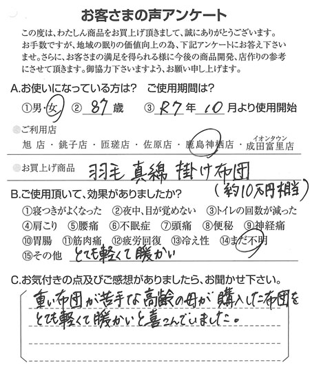 「とても軽くて暖かい」と喜んでいました(羽毛真綿掛け布団) 2025.12.15 重い布団が苦手な高齢の母が、購入した布団を「とても軽くて暖かい」と喜んでいました。茨城県神栖市在住の鹿島神栖店をご利用のお客さまより 購入して良かった!(オーダー枕、オーダー整圧マットレス)前の記事 通年使える万能な一枚だと感じました(生まゆ真綿ふとん)次の記事
