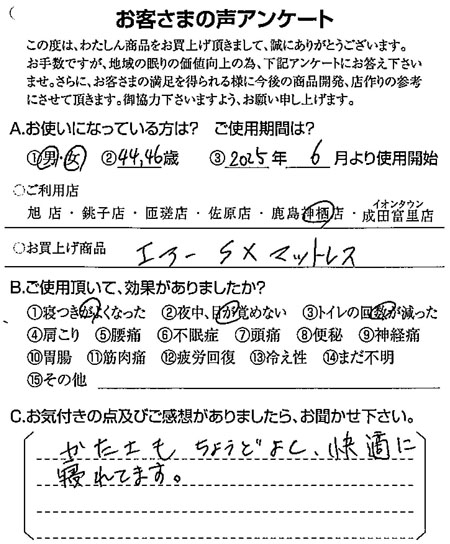 かたさもちょうどよく、快適に寝れてます(AiR-SXマットレス) 2025.07.21 かたさもちょうどよく、快適に寝れてます。茨城県神栖市在住の鹿島神栖店をご利用のお客さまより 丁寧に枕について教えていただきました(オーダー枕/低/エンジェルフロート)前の記事 とても軽く肌ざわりが気持ち良いです(生まゆ真綿ふとん/0.5㎏)次の記事