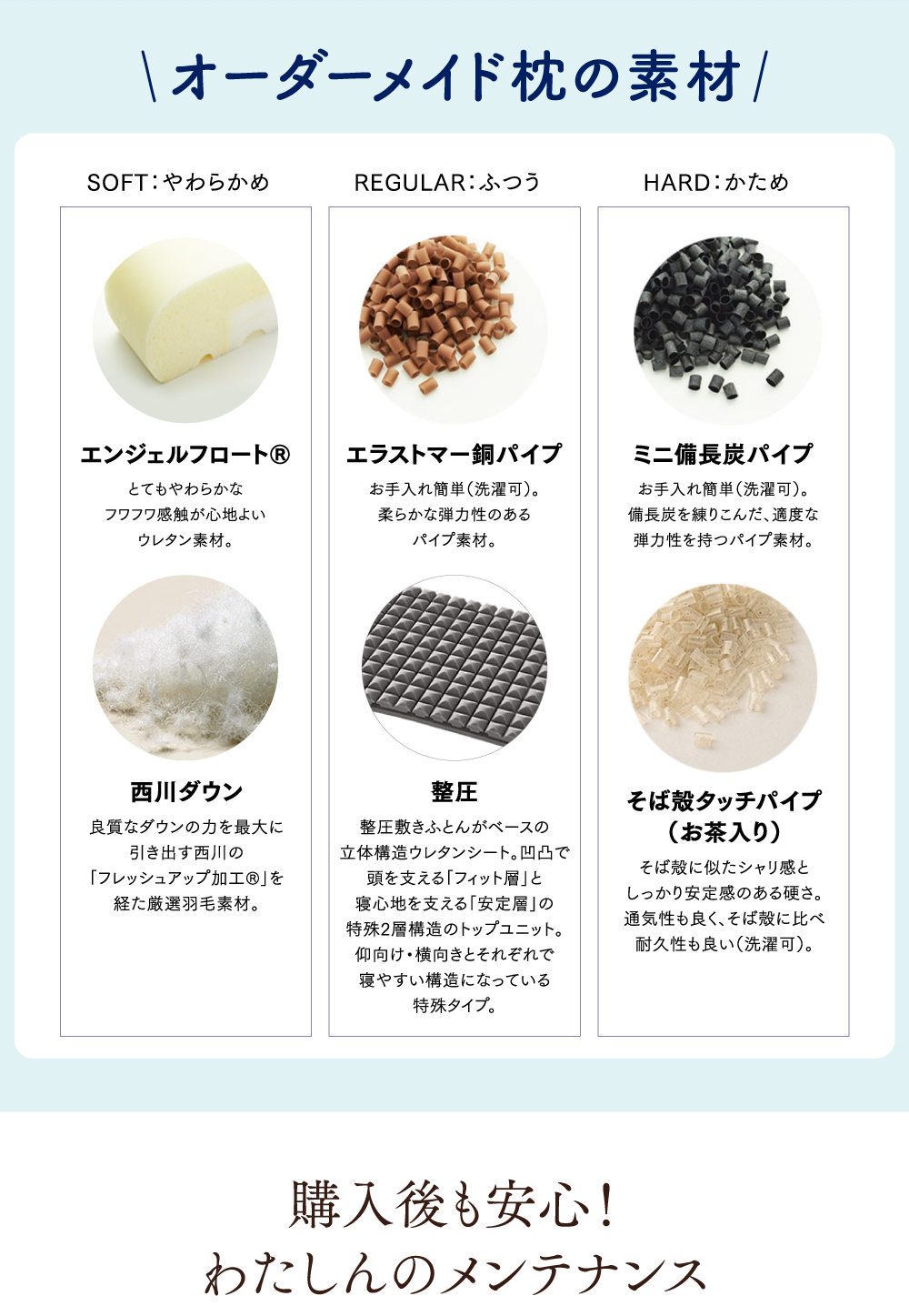 この枕とマットレスに変えてから嫌な夢がなくなった(オーダー枕(整圧ハード)) 2024.09.05 快眠できております(オーダー枕(整圧®中))前の記事 起きたときのだるさ、起き上がりの腰の痛みがなくなりました!(エアーSX・三折りエアーサイクロン内蔵)次の記事