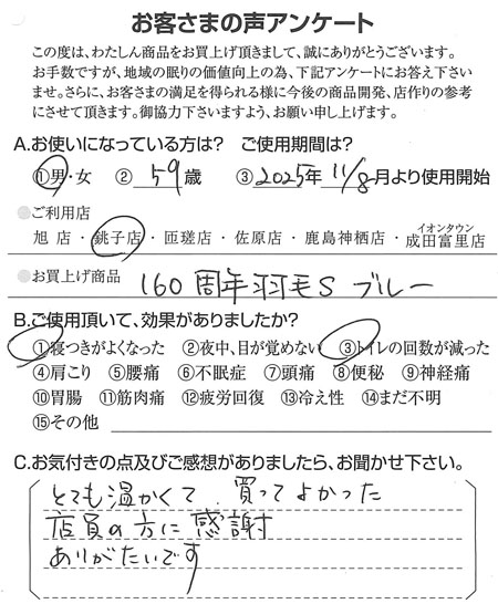 とても温かくて、買ってよかった(160周年羽毛布団/S・ブルー) 2025.12.21 とても温かくて、買ってよかった。店員の方に感謝。ありがたいです。効果を感じた症状:寝つきがよくなった、トイレの回数が減った千葉県銚子市在住の銚子店をご利用のお客さまより 軽くて暖かく寝つきがよくなりました(160周年羽毛布団)前の記事 真夏の暑い時に、ムートンは暑さを感じることなく眠ることができ驚きました(ムートンシーツ/38ミリ)次の記事