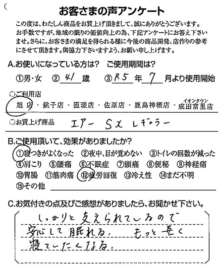 未分類もっと長く寝ていたくなる(AiR SX/レギュラー) 2025.05.17 2025.05.20 しっかりと支えられているので安心して眠れる、もっと長く寝ていたくなる。千葉県旭市在住の旭店をご利用のお客さまよりお客様の声 目覚めが良くなりました(ホワイトダイヤ、整圧マットレス、ヘルシオン、オーダー枕/整圧R)前の記事 お店に行くたびに発見があって楽しいです(ヘルシオン)次の記事