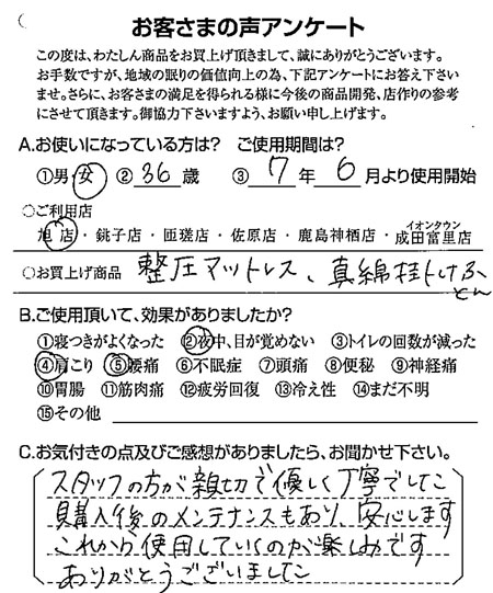 スタッフの方が親切でやさしく丁寧でした(整圧マットレス、真綿掛けふとん) 2025.07.20 スタッフの方が親切でやさしく丁寧でした。購入後のメンテナンスもあり、安心します。これから使用していくのが楽しみです。ありがとうございました。千葉県旭市在住の旭店をご利用のお客さまより すごく眠りの質が良くて朝をスッキリと起きれるように(ウィルムートン)前の記事 大切に使います(ヘルシオン)次の記事