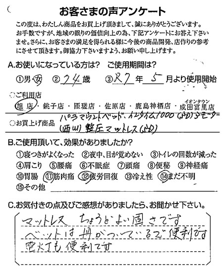 マットレス、ちょうどよい固さです(パラマウントベッドインタイム1000/3D/3モーター、整圧マットレス/3D) 2025.07.20 マットレス、ちょうどよい固さです。ベッドは柵がついているので便利です。電灯も便利です。千葉県銚子市在住の旭店をご利用のお客さまより 聞いてみてたしかめて買う価値はぜったいです(&Free整圧マットレス/レギュラー/S)前の記事 すごく眠りの質が良くて朝をスッキリと起きれるように(ウィルムートン)次の記事