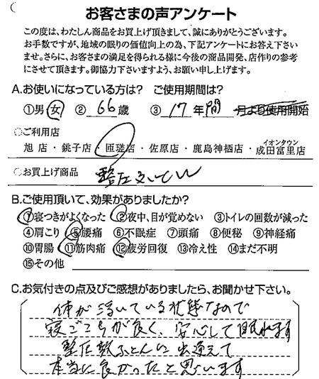 マットレス体が浮いている状態なので…(整圧敷きふとん) 2025.05.20 体が浮いている状態なので寝ごこちが良く、安心して眠れます。整圧敷きふとんに出逢えて本当に良かったと思います。千葉県香取郡在住の匝瑳店をご利用のお客さまよりお客様の声整圧 体の負担が軽減され、睡眠の質が向上した(AiR SXマットレス/ハード)前の記事 仰向けや横向きの姿勢でも腰や肩に負担がかかりません(AiR SX/S)次の記事