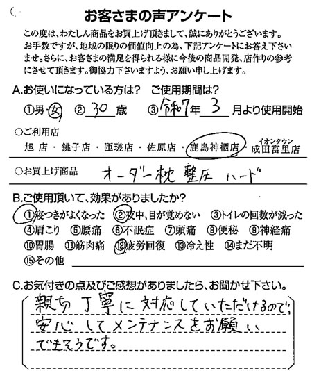 オーダー枕安心してメンテナンスをお願いできそうです(オーダー枕/整圧ハード) 2025.05.20 親切丁寧に対応していただけるので、安心してメンテナンスをお願いできそうです。茨城県鉾田市在住の鹿島神栖店をご利用のお客さまよりお客様の声オーダー枕 とても寝つきが良くなりました(ヘルシオン、整圧マットレス)前の記事 幸せに寝れるようになりました(38㎜ムートンシーツ/シングル)次の記事