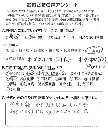 朝まで起きずに寝られるようになった(オーダーマットレス/Dレギュラー、オーダー枕/低・整圧・H) 2025.12.15 何度も寝てから起きてしまっていたが、朝まで起きずに寝られるようになった。千葉県佐倉市在住のイオンタウン成田富里店をご利用のお客さまより 整体へ通わなくなりました(オーダーマットレス/Dハード、オーダー枕/低・整圧・R)前の記事 暖かく軽くて気持ちが良いです(155周年羽毛ふとん)次の記事