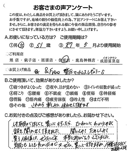 千葉県富里町在住の佐原店をご利用のお客さまより