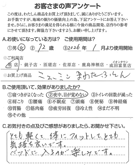 とても軽くて体にフィットして、とても気持ち良いです(ニューミン真綿ふとん) 2026.02.24 とても軽くて体にフィットして、とても気持ち良いです。ベッドに入るのが楽しみです。効果を感じた症状:夜中に目が覚めない千葉県横芝町在住の旭店をご利用のお客さまより 朝、起きた時に体が軽くなった。疲れない。(ムートンシーツ)前の記事 自分に合った物を買う事が出来ています(羽毛ふとん/ハンガリー)次の記事