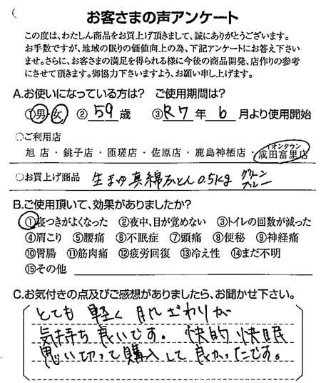 とても軽く肌ざわりが気持ち良いです(生まゆ真綿ふとん/0.5㎏) 2025.07.21 とても軽く肌ざわりが気持ち良いです。快適快眠思い切って購入して良かったです。千葉県成田市在住のイオンタウン成田富里店をご利用のお客さまより かたさもちょうどよく、快適に寝れてます(AiR-SXマットレス)前の記事 冬も枚数少なく良く眠れています(真綿布団)次の記事