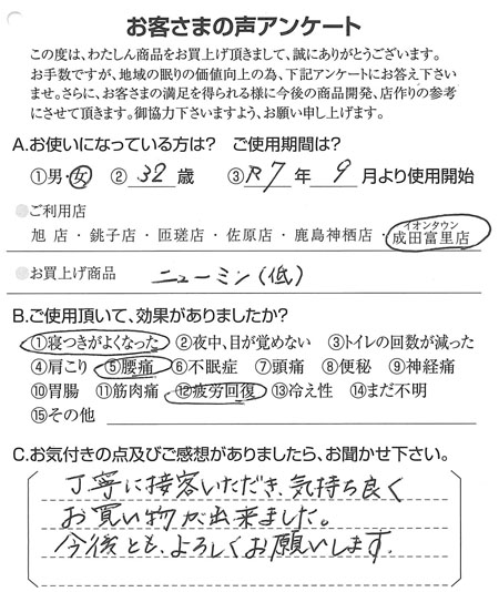 丁寧に接客いただき、気持ち良くお買い物が出来ました(オーダー枕/低・ニューミン) 2025.10.30 丁寧に接客いただき、気持ち良くお買い物が出来ました。今後とも、よろしくお願いいたします。千葉県印西市在住のイオンタウン成田富里店をご利用のお客さまより スーッとねむりに入れた(オーダー枕/ニューミン)前の記事 通年使える万能な一枚だと感じました(生まゆ真綿ふとん)次の記事