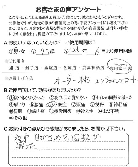 夜中、目がさめる回数が減った。(オーダー枕/エンジェルフロート) 2025.10.30 夜中、目がさめる回数が減った。千葉県佐倉市在住のイオンタウン成田富里店をご利用のお客さまより このムートンで3枚目ですが離せません(ムートン)前の記事 腰痛も無くなりよく眠れています(整圧ふとん)次の記事