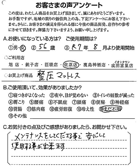 安心して使用する事が出来ます(整圧マットレス) 2025.09.09 メンテナンスをしてくださる事で安心して使用する事が出来ます。千葉県香取市在住の佐原店をご利用のお客さまより 同じ悩みをもつ人に教えてあげたいです(整圧マットレス)前の記事 一年中手放せない布団です(生繭真綿)次の記事