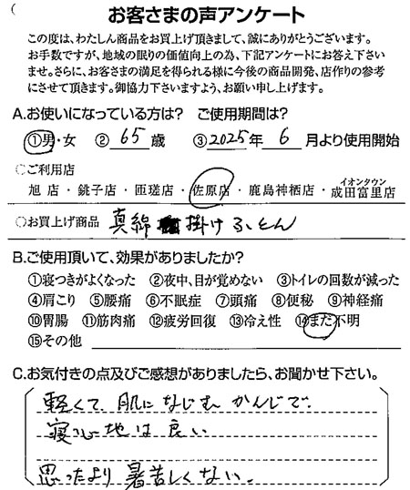 思ったより暑苦しくない(真綿掛けふとん) 2025.08.17 軽くて肌になじむかんじで、寝心地は良い。思ったより暑苦しくない。千葉県香取市在住の佐原店をご利用のお客さまより 足がつらなくなった(生まゆ真綿1.0㎏)前の記事 同じ悩みをもつ人に教えてあげたいです(整圧マットレス)次の記事