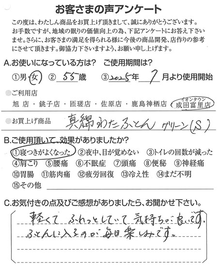 軽くて、ふわっとしていて気持ちが良いです(真綿ふとん/グリーン/S) 2026.02.24 軽くて、ふわっとしていて気持ちが良いです。ふとんに入るのが毎日楽しみです。効果を感じた症状:寝つきがよくなった千葉県酒々井町在住のイオンタウン成田富里店をご利用のお客さまより もっと早く買えばよかった(オーダーメイド枕/整圧レギュラー)前の記事 睡眠が楽しみになりました(ヘルシオン)次の記事