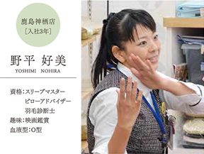 接客の仕事に興味があり、選んだのがこの寝具販売の仕事でした。接客業は未経験ではじめは戸惑いの連続で、失敗も絶えませんでした。そんな私を先輩方が励まし助けてくれて、いろいろと教えてくださったおかげで、今も頑張ることができています。また、研修会や講習会等へ参加することにより、ピローアドバイザーや羽毛診断士の資格をとることができ、接客の幅が広がりました。オーダー枕を作っていただいたお客さまから「よく眠れるようになったよ」などの声を聞くととても嬉しく思います。寝具を通じ地域の皆様の健康に貢献できればと思います。